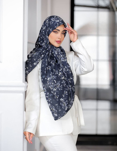 روسری نخی قواره 140.سورمه ایی تیره وگل قرمز