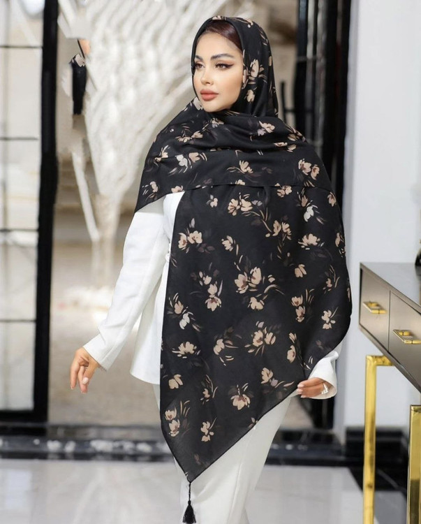 روسری نخی 4 فصل قواره بزرگ با طرح گل زمینه مشکی بهاری کد298